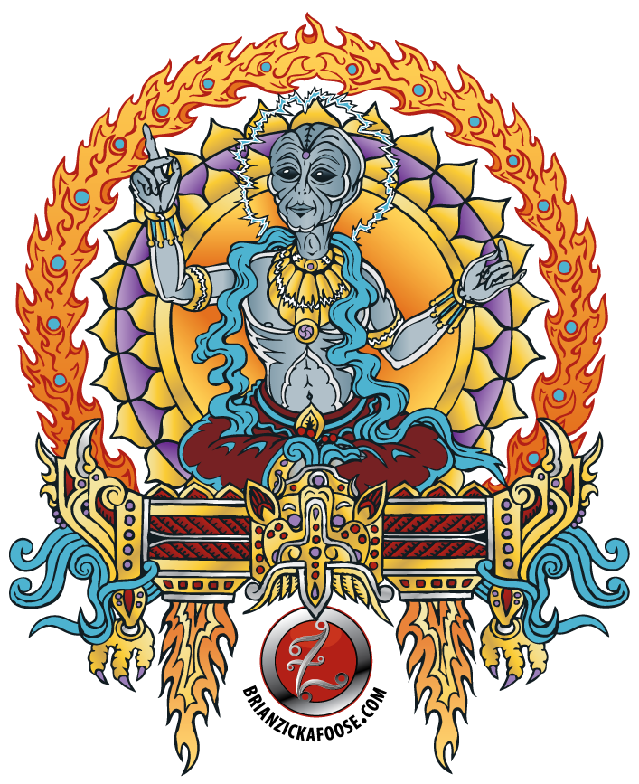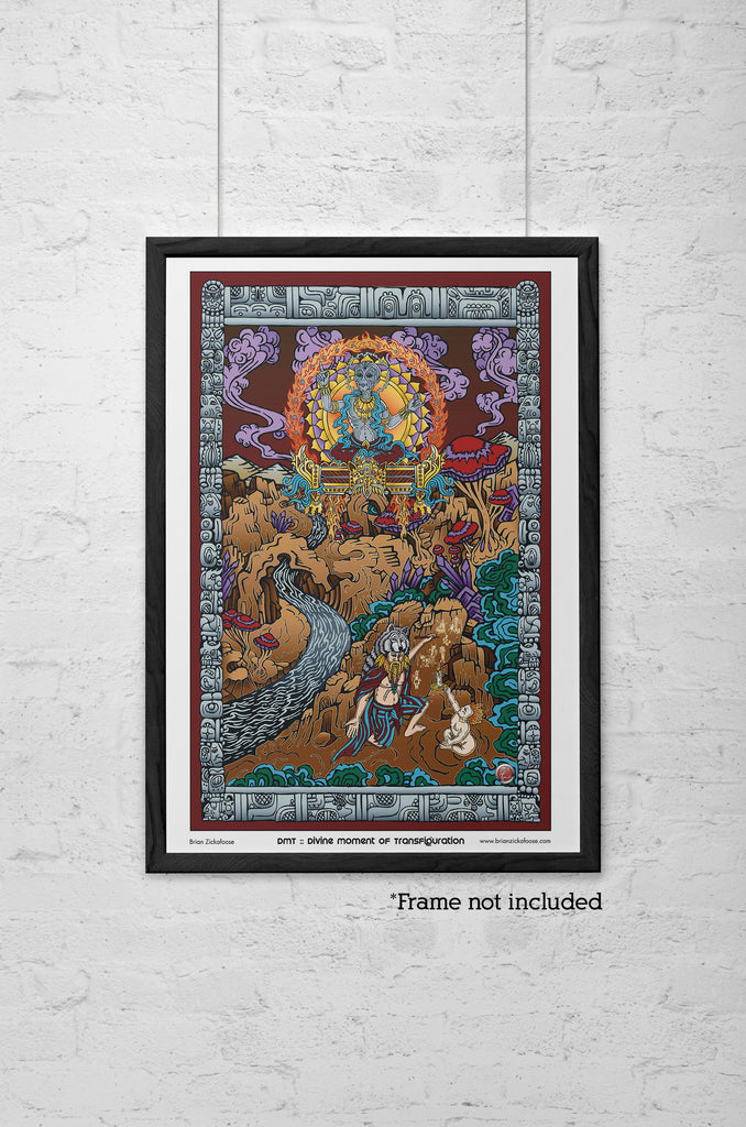 Step into the enigmatic world of "DMT-Divine Moment of Transfiguration," an intricate illustration by artist Brian Zickafoose. Delving into mysteries surrounding supernatural agents, inter-dimensional astronauts, and altered perceptions, this artwork transports you through aeons to an era when artists and shamans were one. The collective consciousness and the tribe's well-being depended on the ethereal explorations of the medicine man. Specially chosen forest fruits held messianic properties, consumed to unravel the paradox of the grand illusion we call reality.